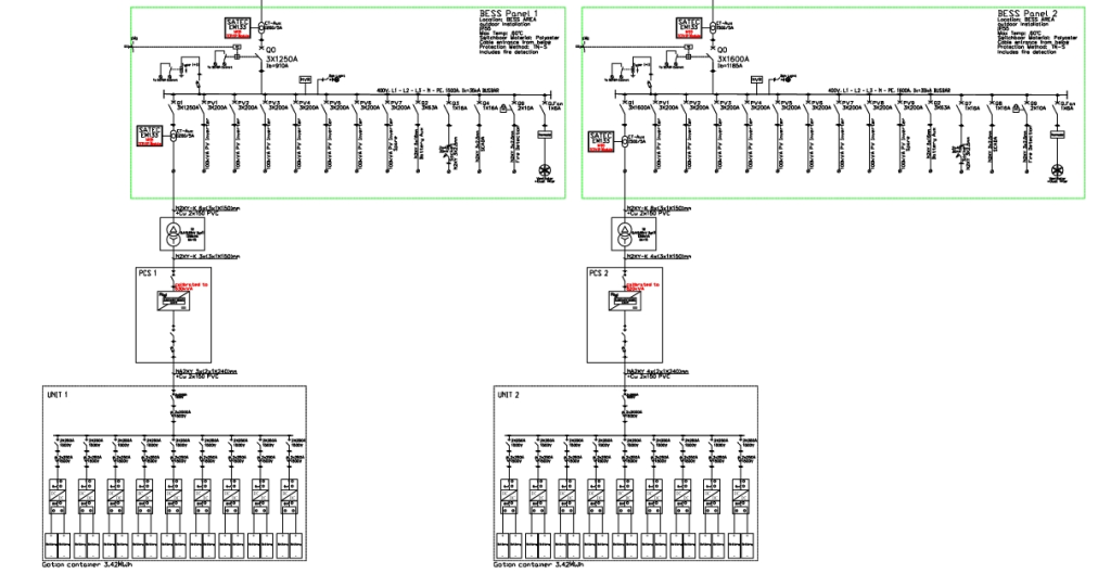 Our BESS is capable of maintaining stable operation during short-circuits, considering the actual line voltage values relative to the mains voltage level at the point of connection, both before and after the fault.
