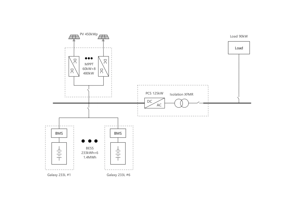 Um diese Herausforderungen zu bewältigen, ist die Integration eines gut dimensionierten Batteriespeichersystems (BESS) mit einer Kapazität von 1,4 MWh unerlässlich. Das BESS speichert überschüssige Solarenergie während des Tages und liefert Strom während der Nacht oder wenn die Solarproduktion unzureichend ist. Mit einem entsprechend gestalteten BESS stellt das System sicher, dass die 90 kW Last nahtlos über den gesamten 20-Stunden-Zeitraum betrieben wird, wobei Systemzuverlässigkeit und Effizienz erhalten bleiben. Um die Systemstabilität weiter zu erhöhen und gegen potenzielle elektrische Störungen zu schützen, wird auch ein Isolationstransformator eingebaut, um Oberschwingungen zu mindern und elektrische Isolation zu bieten, wodurch der reibungslose Betrieb empfindlicher Geräte gewährleistet wird.