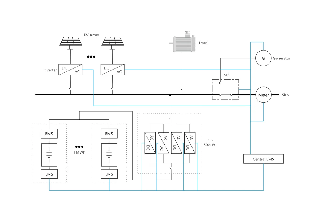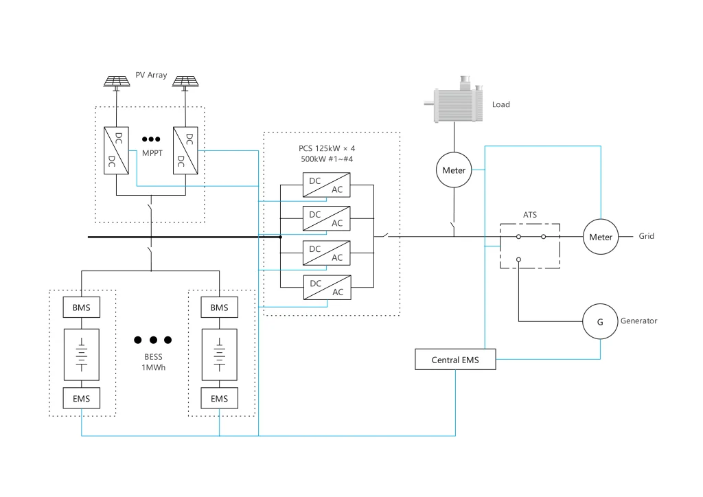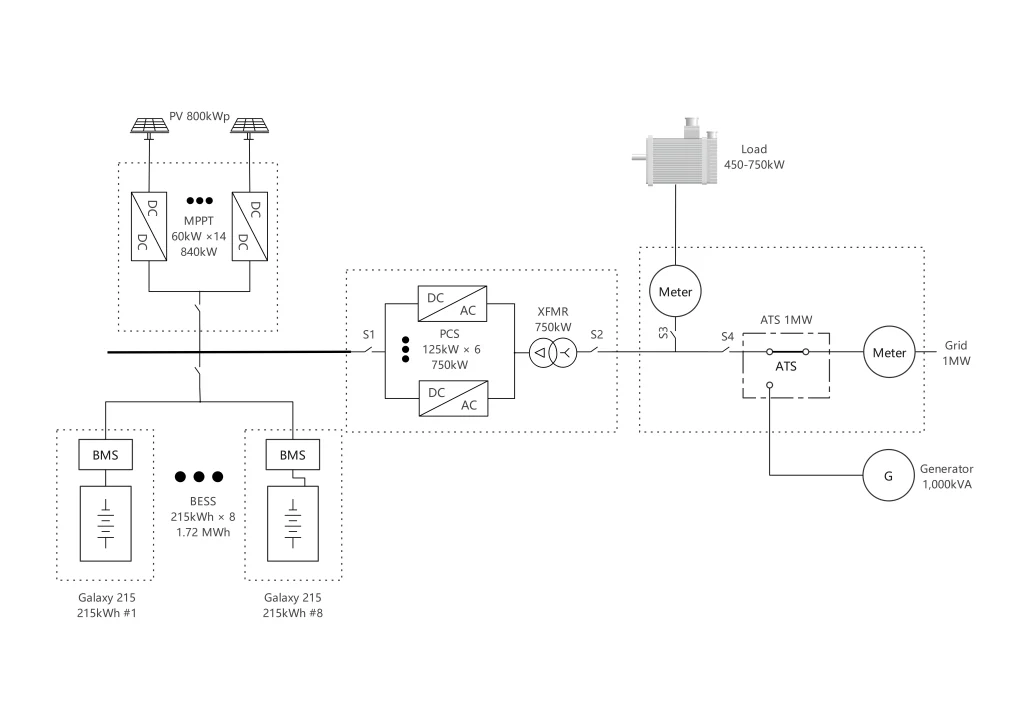 Dada la alta proporción de cargas inductivas de la fábrica, se integrarán transformadores de aislamiento para proteger el sistema al mitigar interferencias eléctricas y armónicos, asegurando una operación suave y estable. Además, un robusto sistema de gestión de energía (EMS) monitoreará y controlará activamente la distribución de energía, optimizando la gestión de cargas para mejorar el rendimiento general y asegurar la estabilidad a largo plazo de toda la microred.