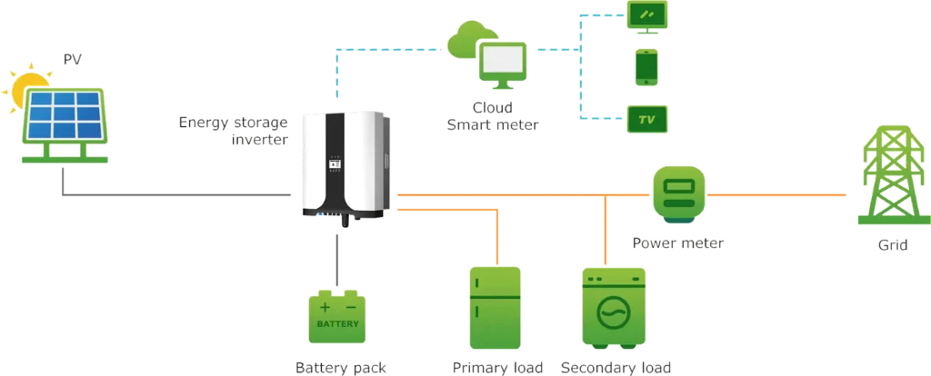 Los inversores de la serie KY-EST12KH / KY-EST15KH / KY-EST17KH / KY-EST20KH, también conocidos como inversores solares híbridos o bidireccionales, son adecuados para la gestión energética de sistemas de energía solar, como fotovoltaicos, células, cargas y redes eléctricas. La electricidad generada por los paneles fotovoltaicos se utiliza para suministrar energía eléctrica a hogares y cualquier exceso de energía eléctrica se puede almacenar en baterías. Cuando la batería está completamente cargada, el usuario puede enviar la energía excedente a la red eléctrica.