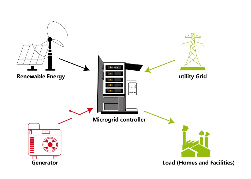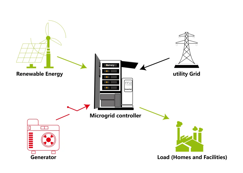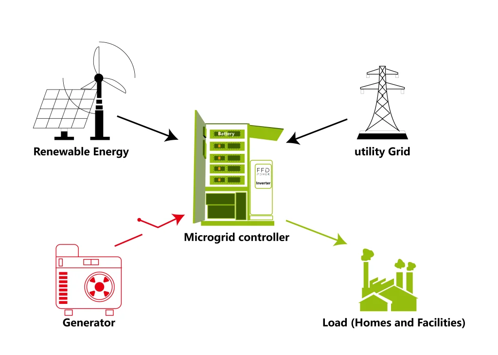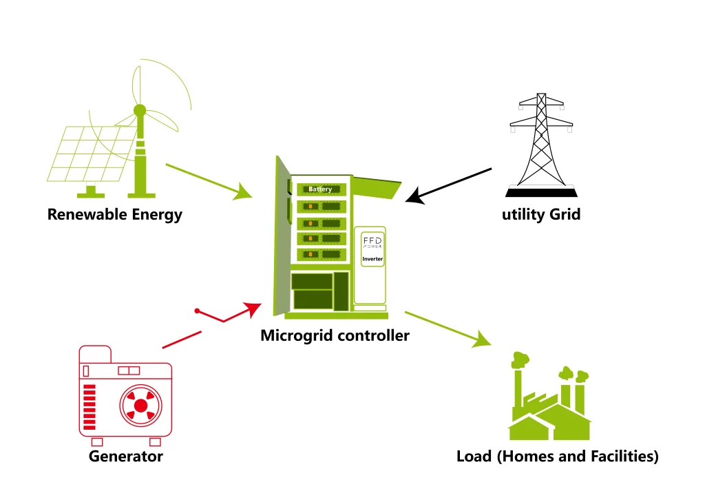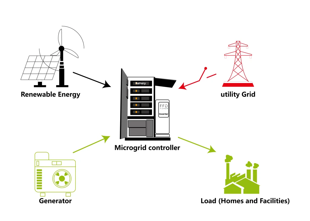 FFD POWER delivers a fully integrated turnkey microgrid solution designed for commercial and industrial applications. Our system seamlessly combines onsite power generation (solar, wind, or diesel generators) with an advanced Battery Energy Storage System (BESS) and intelligent controls. This plug-and-play solution can operate both off-grid and grid-tied, ensuring reliable and efficient energy management.