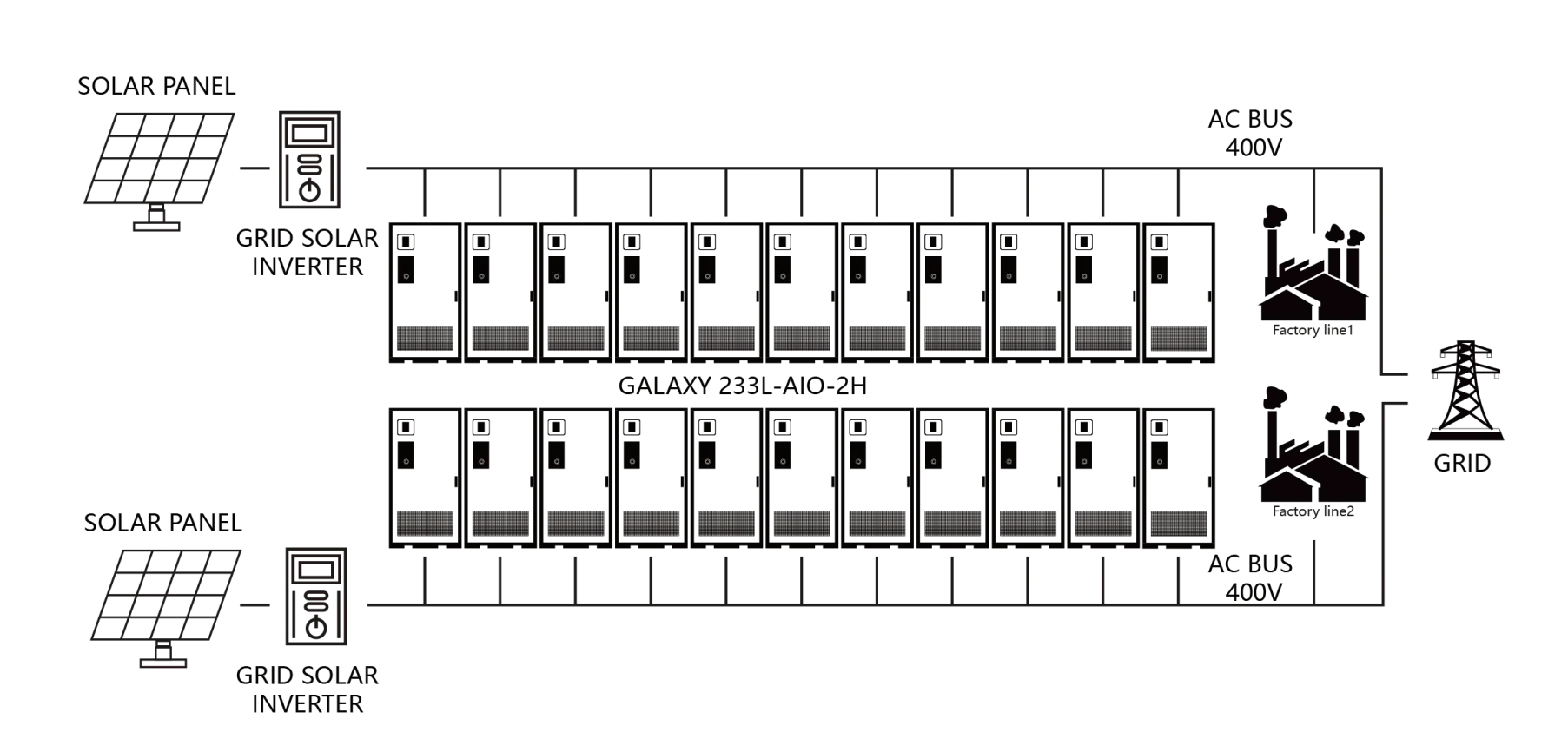 • The GALAXY 233L-AIO-2H energy storage cabinets, integrated via AC coupling, offer efficient storage and discharge capabilities while addressing logistical limitations.